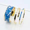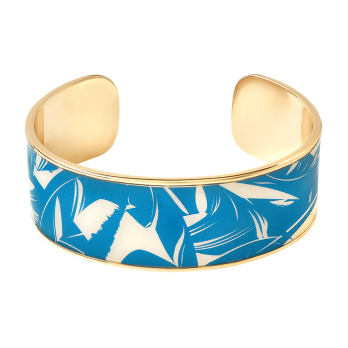 Bleu Myosotis 藍色手鈪Bangle Up 的一款時尚手鐲,以亮麗藍色襯托金色設計,靈感來自加州海岸棕櫚葉圖案。這款手鐲兼具現代感與經典風格,是日常佩戴和特別場合的理想配飾。